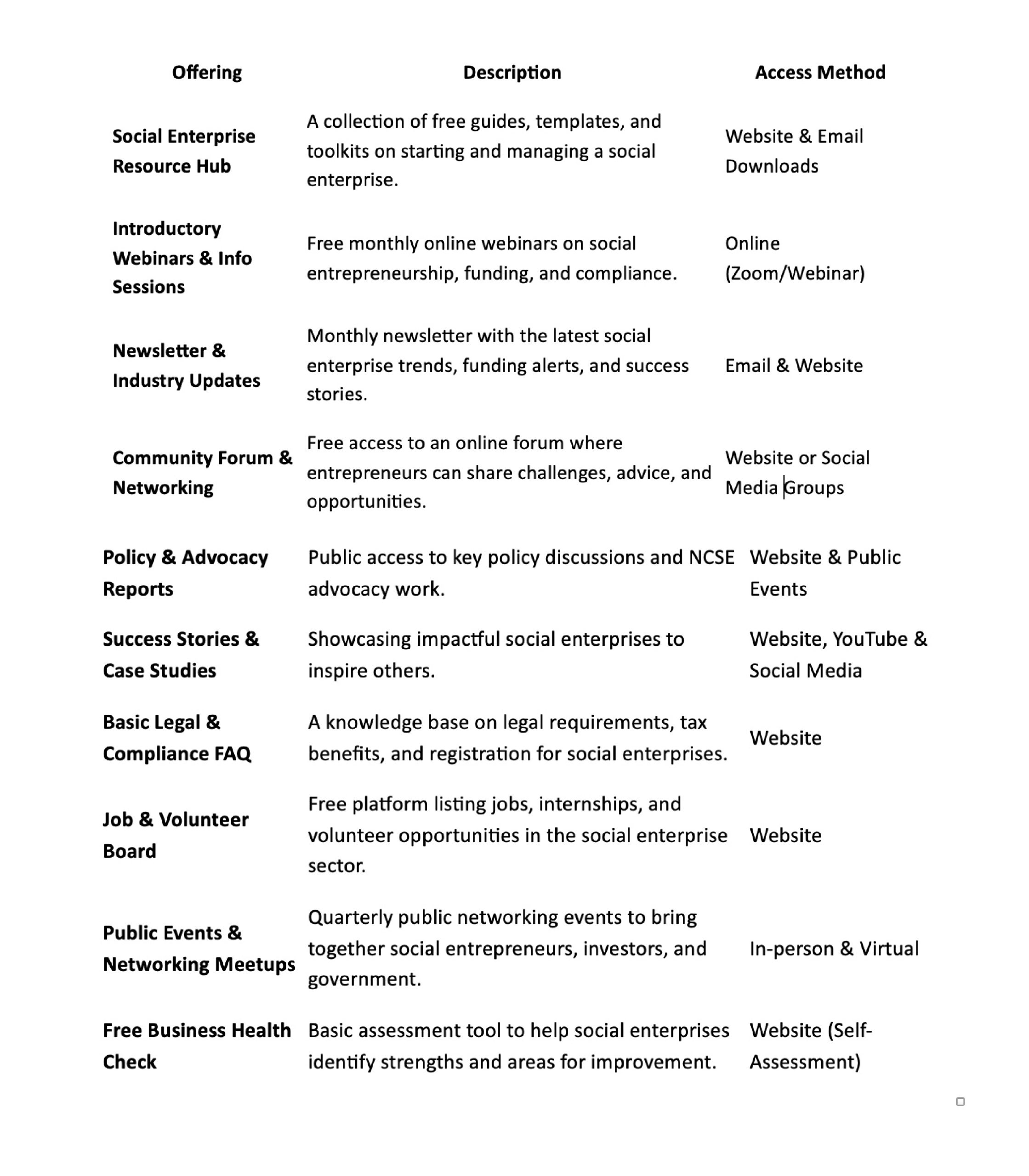 A strong bouquet of free offerings created to position the National Council for Social Enterprises (NCSE) as a key authority in the sector. Here’s a list of valuable free offerings for the public: